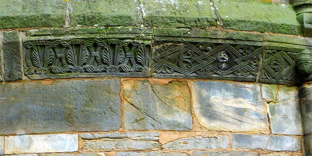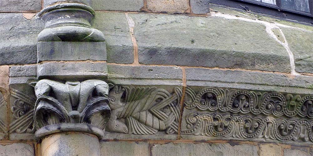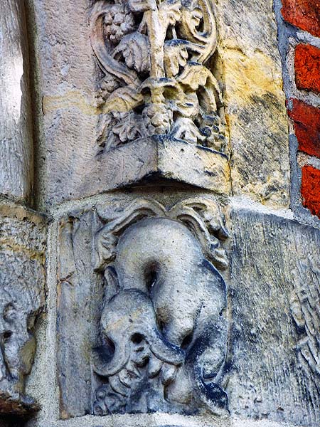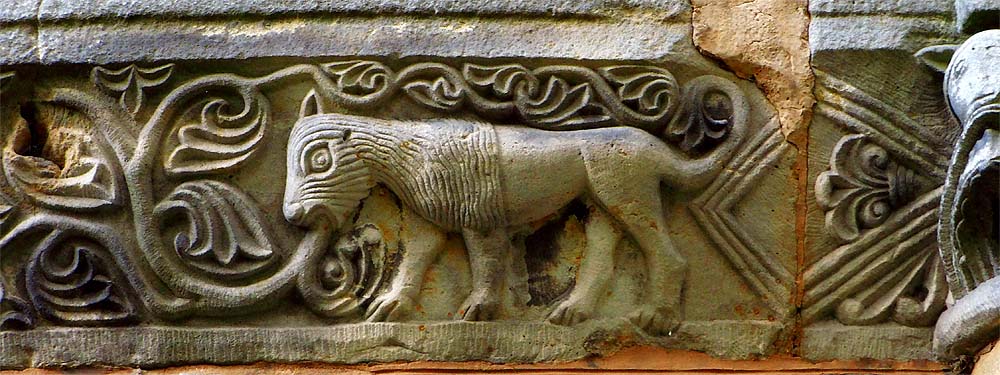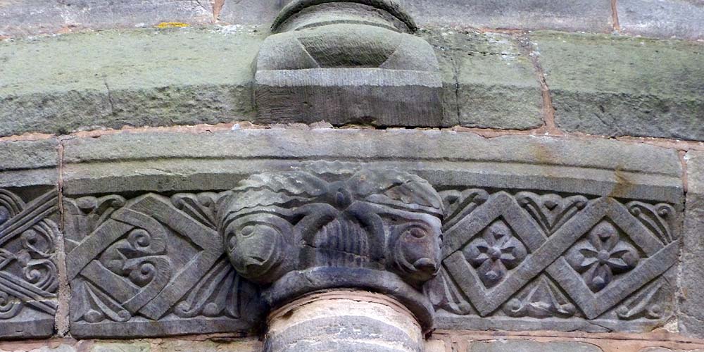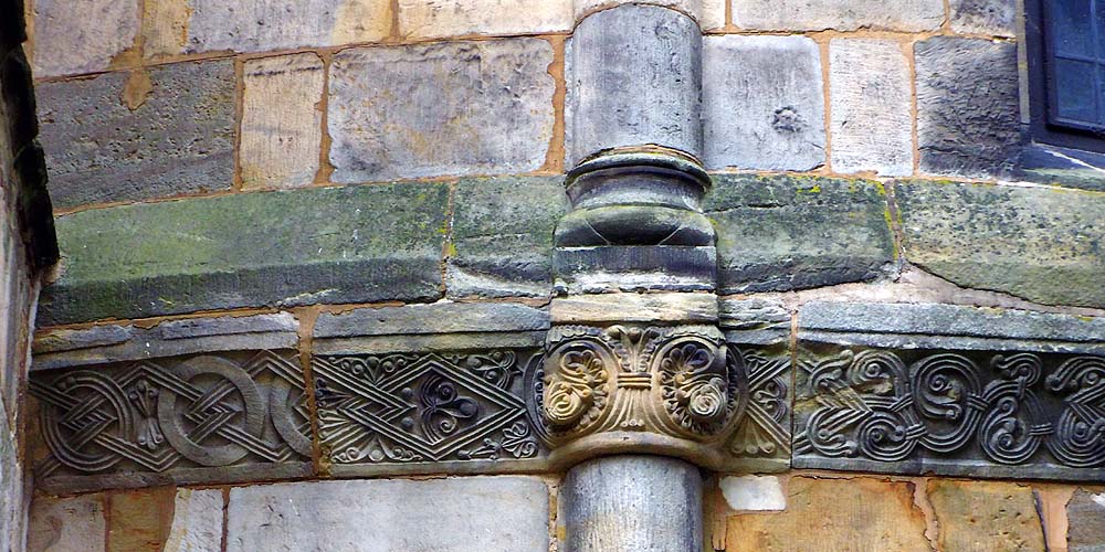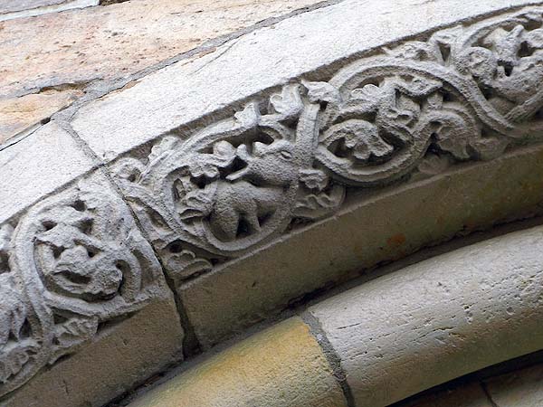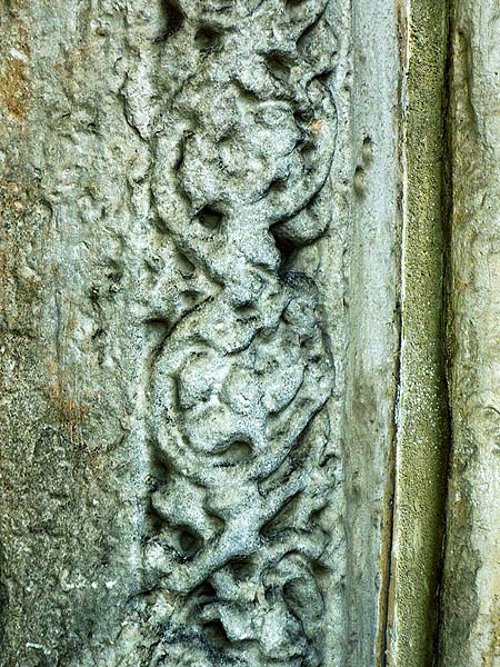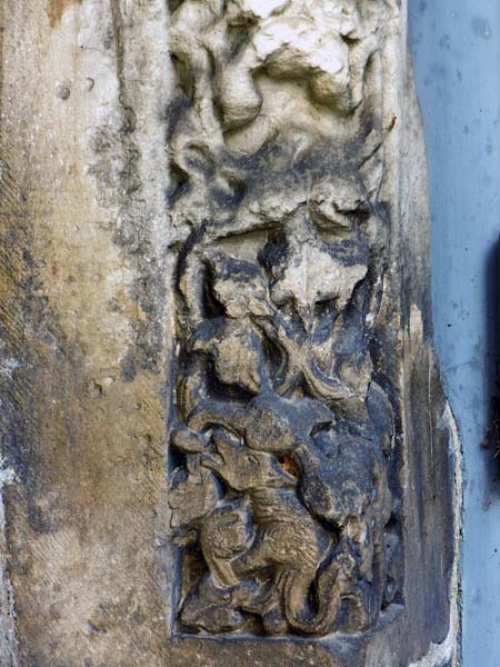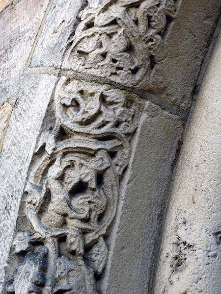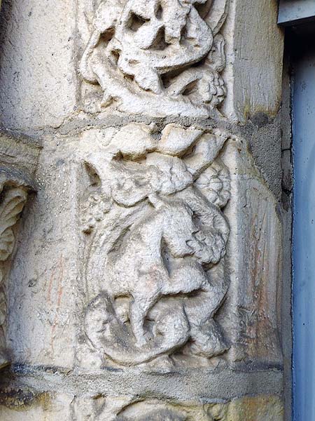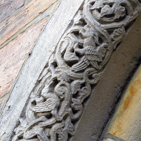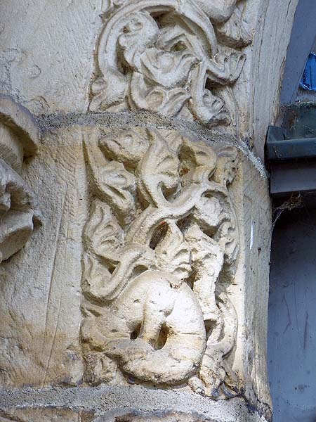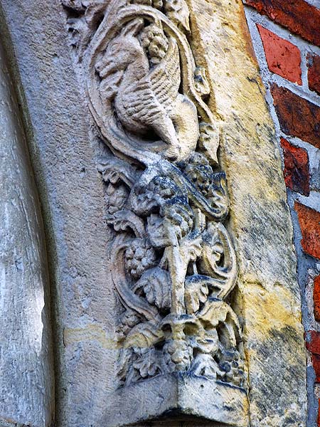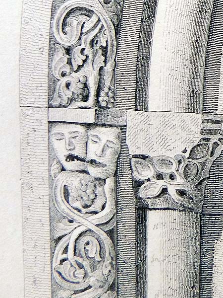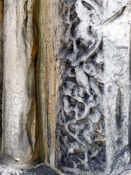 Den südlichen Pfeiler, dessen Kapitäl an den 4 Ecken durch die kaum erkennbaren Evangelistenzeichen, an den 4 Fronten durch die Darstellungen eines Stiers, eines Drachen, eines menschlichen Kopfes und eines rosettenförmigen Ornamentes in roher Weise ausgezeichnet ist, haben wir Blatt 40, Fig. 3, 4, 5, 6 abgebildet Mit größerer Geschicklichkeit ist die in weichem Sandstein ausgeführte und deshalb leider schon stark verwitterte Ornamentation der beiden einander gegenüberliegenden Portale (siehe Blatt 39 und 40) ausgeführt. Die Kapitäle des Inneren, bereits die gotische runde Form, und ihre naturalistische Decorationsweise kündet ebenfalls schon den