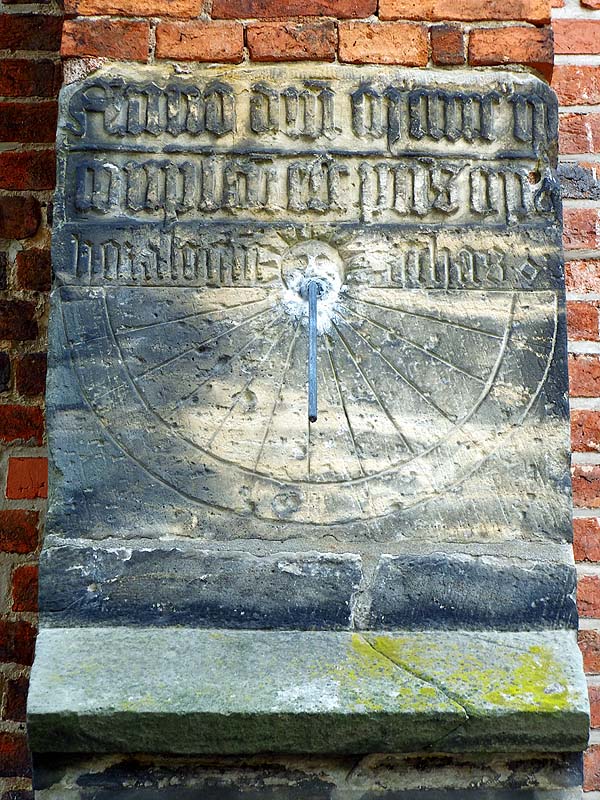 Diese Umstände bilden die Beweisgründe, daß die Form des sehr alterthümlich scheinenden Thurmes modern ist. Andere Beweisgründe dafür finden wir am Thurme selbst, indem an der Ostseite desselben in halber Dachhöhe durch Backsteine die Jahreszahl MDCL eingemauert ist. Auch die Nord- und Südseiten des Thurmes sind neu, und nur die Westseite ist alt. Aber auch die Fortsetzung der Mittelschiffwände im Thurme und ebenso das südöstlich und nordwestlich sich über das Seitenschiff erstreckenden kurzen und dicken Mauerstücke sind alt, und dürfen wir hieraus nicht zweifeln, daß südlich und nördlich in der Breite des jetzigen Thurmes den Achsen der Seitenschiffe entsprechend sich zwei Thürme erhoben, die in einer Restauration MDCL (1650) größentheiIs abgetragen sind, wornach die jetzige seltsame Thurmform entstanden ist.