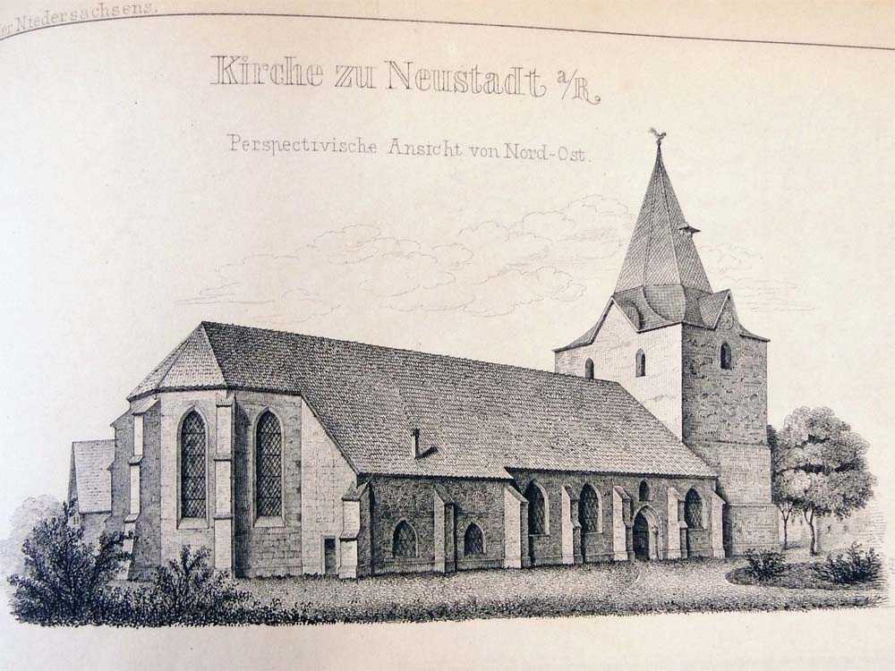 Ueber die in Neustadt am Rübenberge (an der Leine), drei Meilen unterhalb Hannover, belegene Kirche haben wir leider keine historische Nachrichten auffinden können, die über die Gründung derselben Aufschluß gäben. Aus den geschichtlichen Notizen über Mandelsloh‘s Vorzeit von Fiedeler (Zeitschr. des hist. Vereins für Niedersachsen, 1857) entnehmen wir indeß, daß die Kirche von Neustadt a. R. zu dem Mindener Archidiaconate Mandelsloh gehörte, daß im Jahre 1280 die Stiftsherren (canonici) des von Ahlden nach Neustadt verlegten Collegiatsstifts die Neustädter Kirche von den Mandelsloher Synodal-Anrechten befreieten, und der Bischof Volquin (in Minden) die Synodal-Anrechte über Neustadt nunmehr dem Archidiacon zu Ahldeu beilegte.