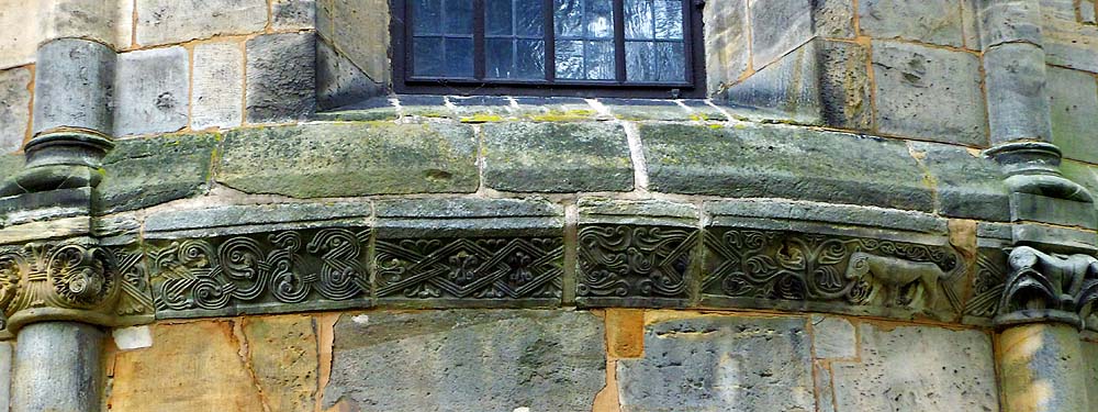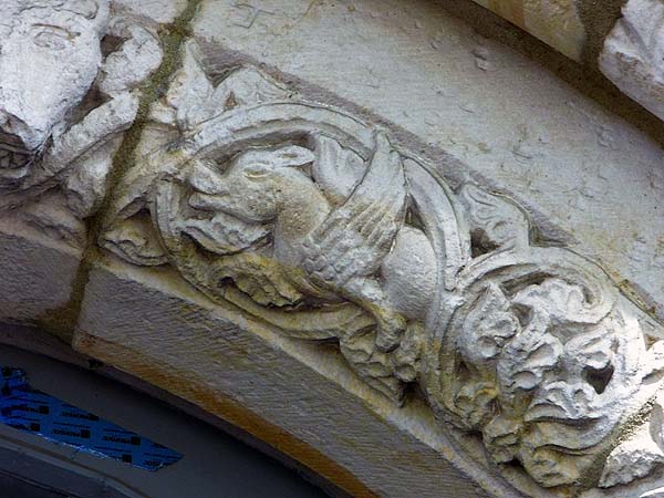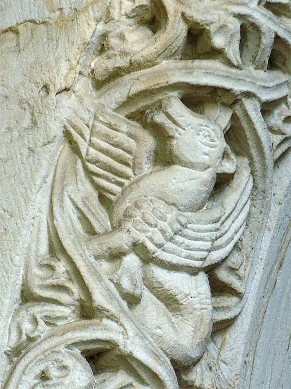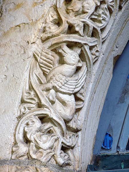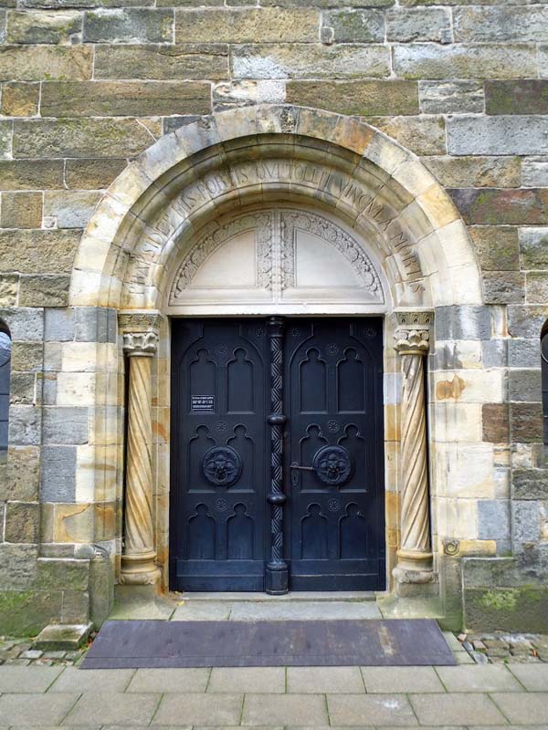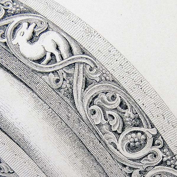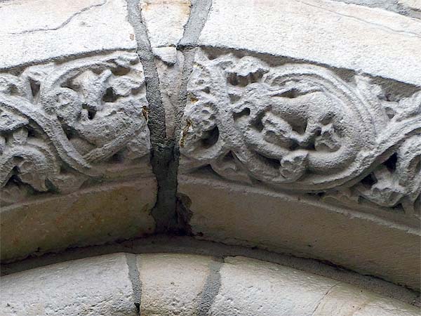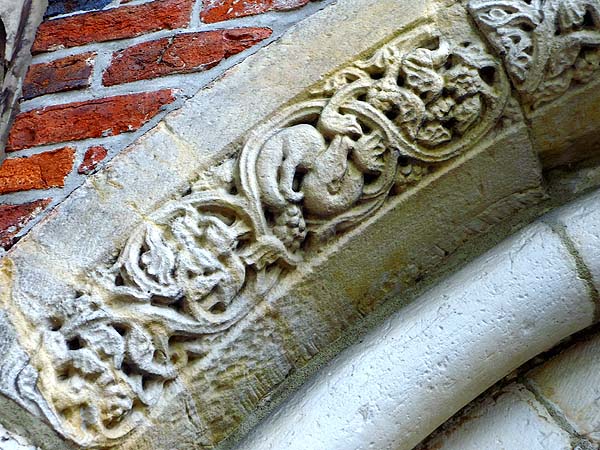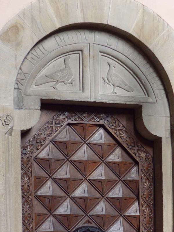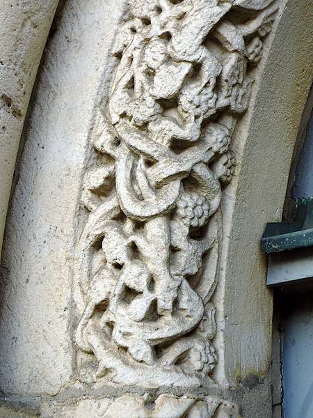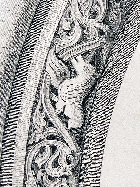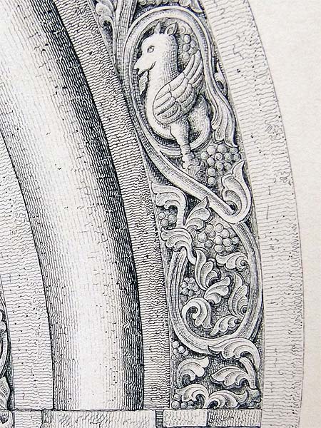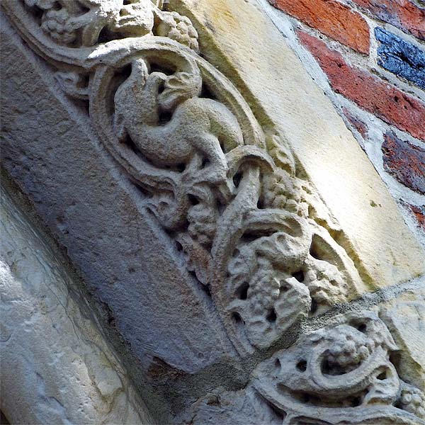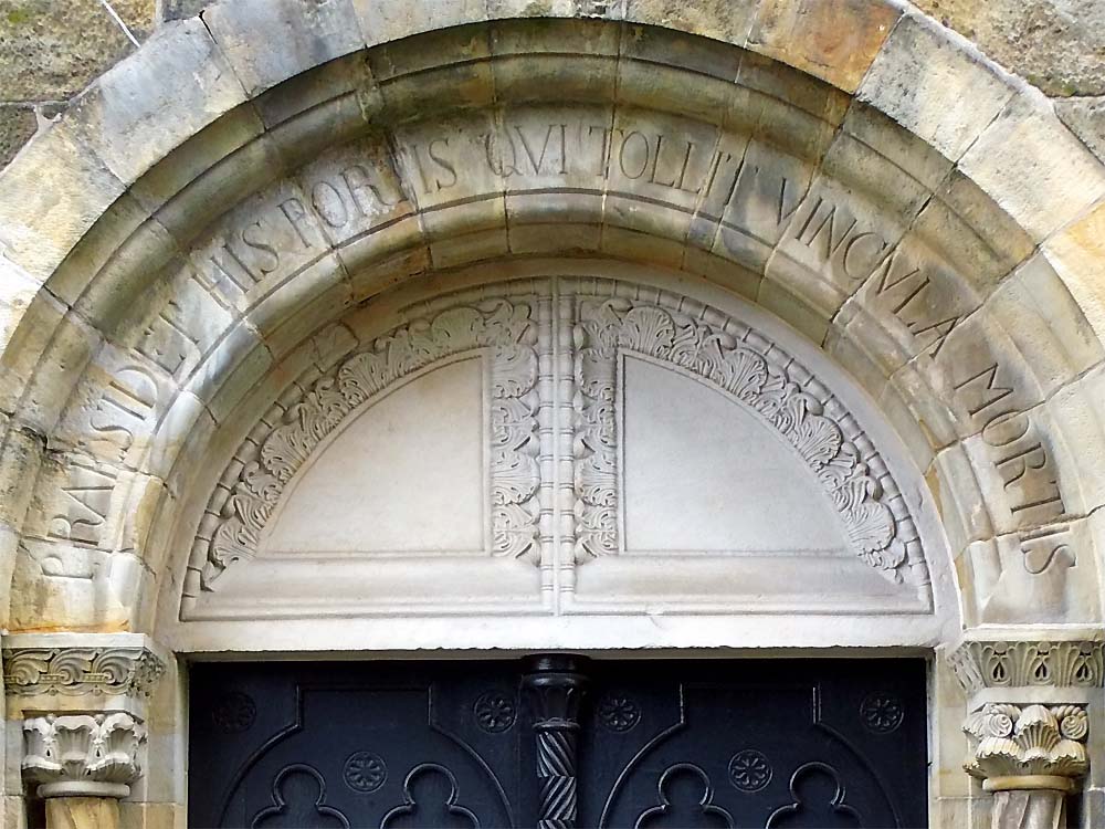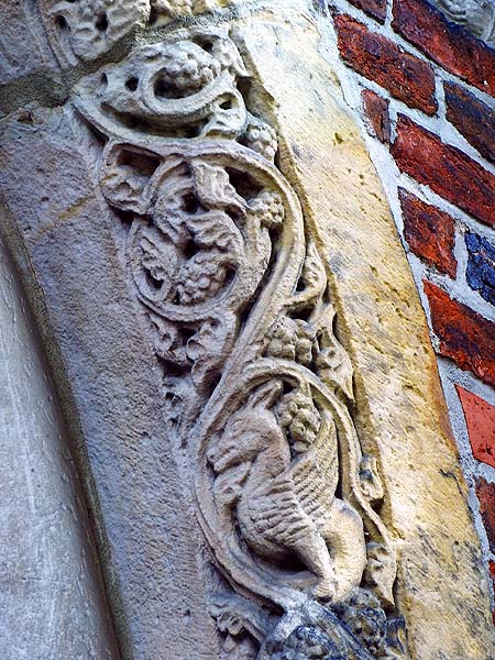 Wir wollen nicht versäumen hier noch eines Tympanons zu erwähnen, das früher an der Nordseite der Kirche bei irgend einer Restauration eingemauert war. Dasselbe gehörte wegen seiner kleinen Form einer sehr zierlichen Thür an. Gegenwärtig ist es im Innern verwandt über der aus der nördlichen Capelle auf den Chor führenden Thür. Es ist zweigetheilt; auf jeder Seite steht eine Taube, die Köpfe nach oben gerichtet, beide gegen die Mitte hinschreitend. Wie es scheint, ist eine männliche und eine weibliche Taube dargestellt, indem sich beide dadurch unterscheiden, daß die eine (rechts für den Beschauer) einen Hollen (aufrecht stehende Federn) auf dem Kopfe hat. Auf dem Rande steht die Inschrift: PAX hVIC DOMVI ET OMNIBUS. Das Bild und die Inschrift scheinen auf wünschenswerthes friedliches Beisammensein der männlichen und weiblichen Stiftseingesessenen hinzudeuten.