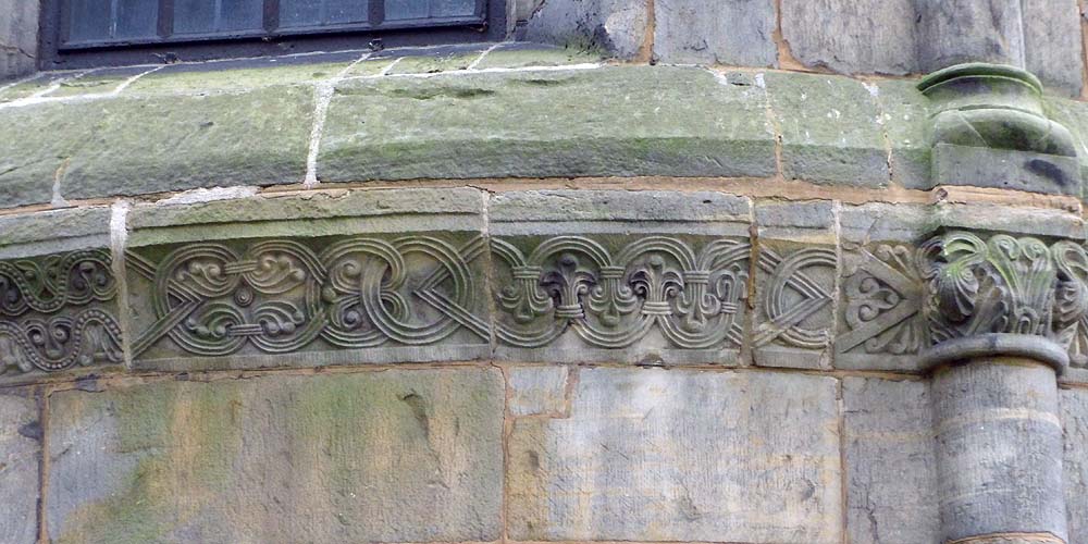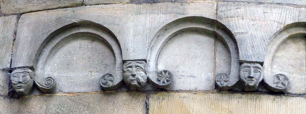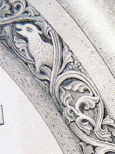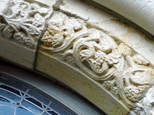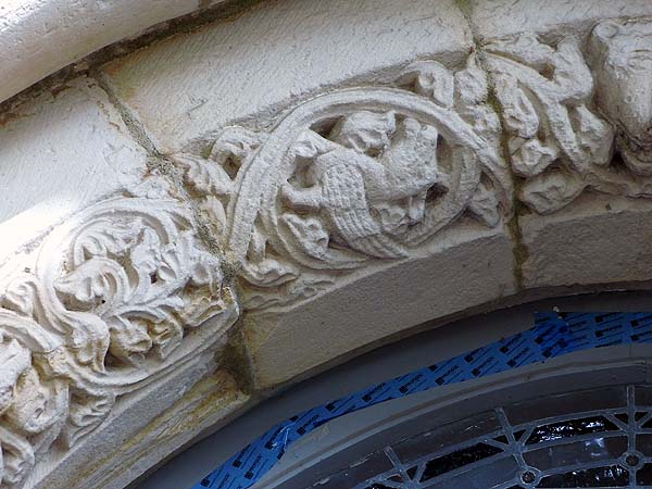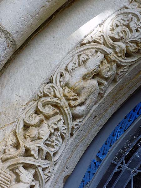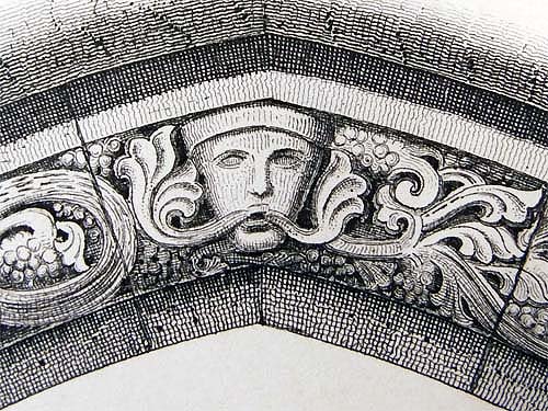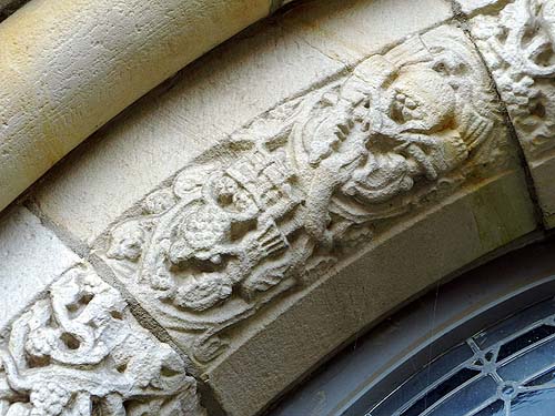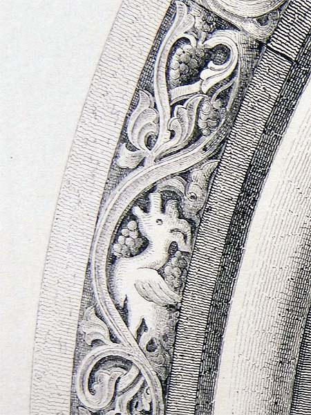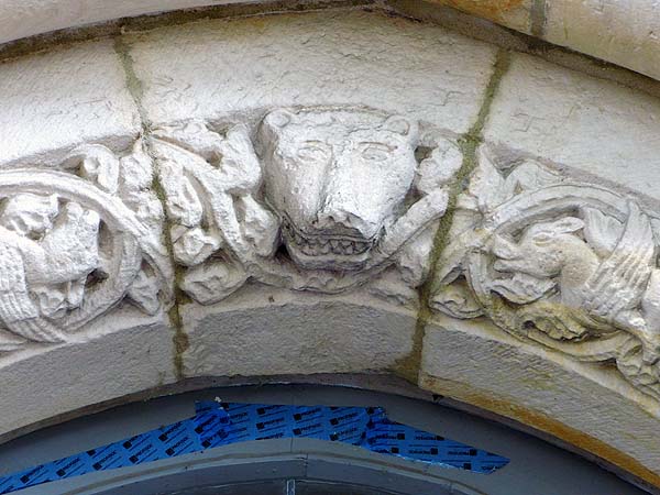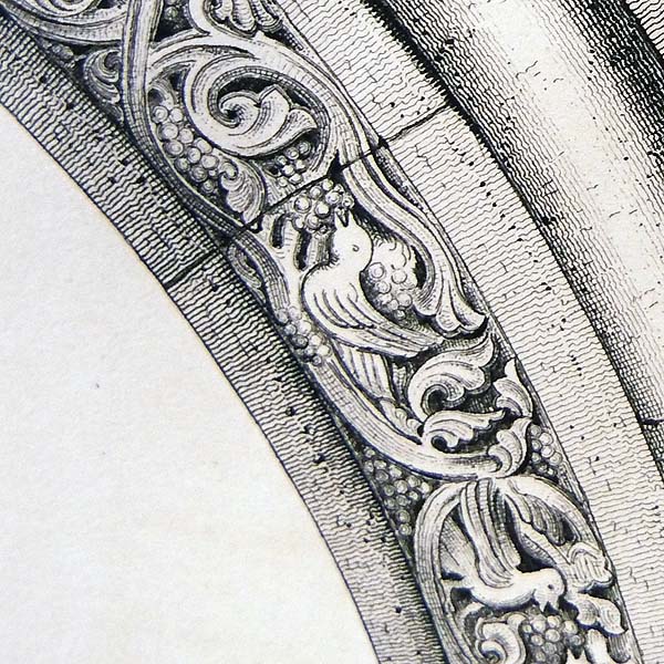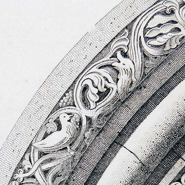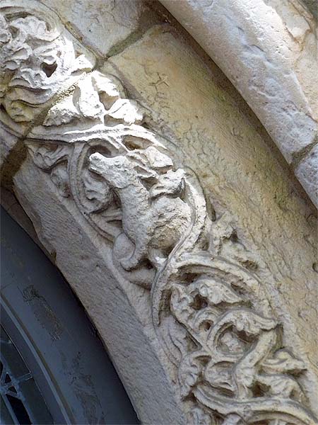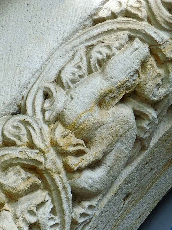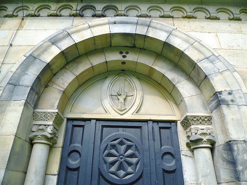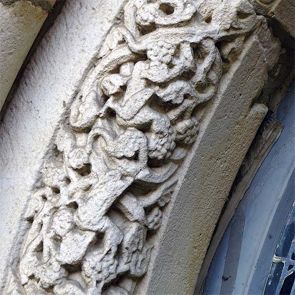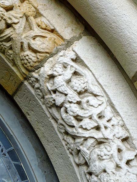 Wir wollen nicht versäumen hier noch eines Tympanons zu erwähnen, das früher an der Nordseite der Kirche bei irgend einer Restauration eingemauert war. Dasselbe gehörte wegen seiner kleinen Form einer sehr zierlichen Thür an. Gegenwärtig ist es im Innern verwandt über der aus der nördlichen Capelle auf den Chor führenden Thür. Es ist zweigetheilt; auf jeder Seite steht eine Taube, die Köpfe nach oben gerichtet, beide gegen die Mitte hinschreitend. Wie es scheint, ist eine männliche und eine weibliche Taube dargestellt, indem sich beide dadurch unterscheiden, daß die eine (rechts für den Beschauer) einen Hollen (aufrecht stehende Federn) auf dem Kopfe hat. Auf dem Rande steht die Inschrift: PAX hVIC DOMVI ET OMNIBUS. Das Bild und die Inschrift scheinen auf wünschenswerthes friedliches Beisammensein der männlichen und weiblichen Stiftseingesessenen hinzudeuten.