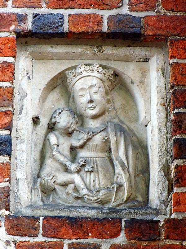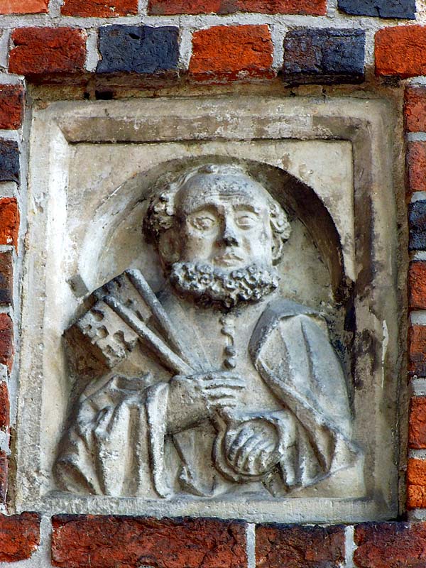 Die aus Ziegeln hergestellten Gewölbe des Innern haben birnenförmig profilirte Gurten von der Breite eines halben Steines und Haupt- und Diagonalgurten sind von gleicher Stärke. Die Schlußsteine daselbst sind abgestumpfte Kegel, deren Unterseite meist glatt gelassen ist; nur fünf Schlußsteine des südlichen Seitenschiffes scheinen in Thon gebrannt zu sein, und zeigen in zierlichem Relief an ihrer Unterseite vier Apostelbrustbilder und eins einen predigenden Mönch darstellend. — Fig. 4 Blatt 39 zeigt das gothische Sockelprofil des Aeußeren von 1500.
