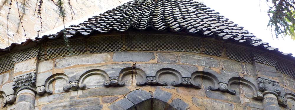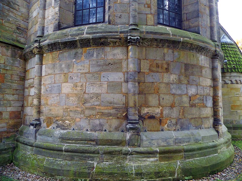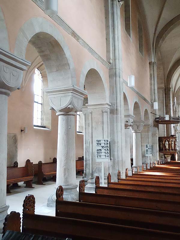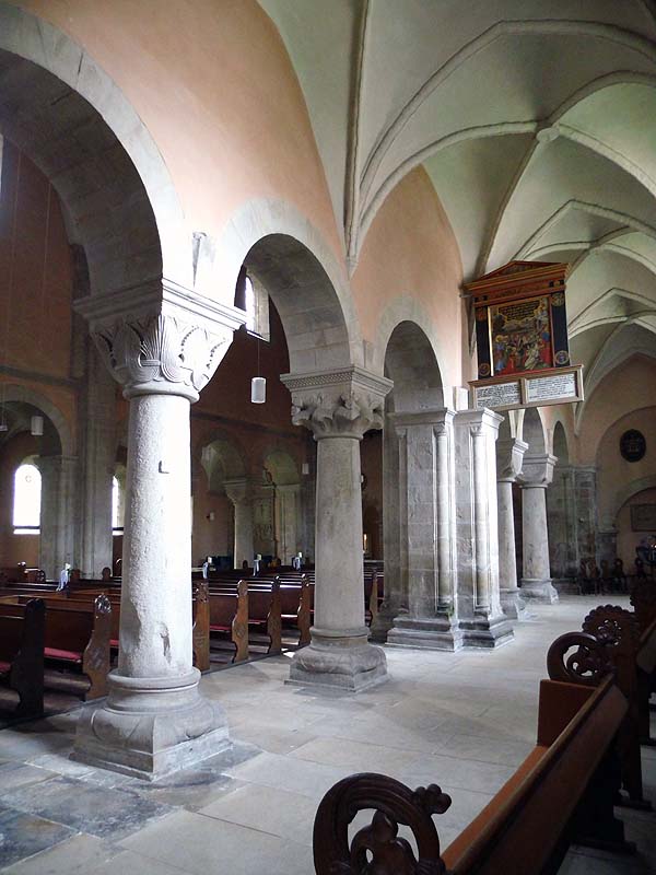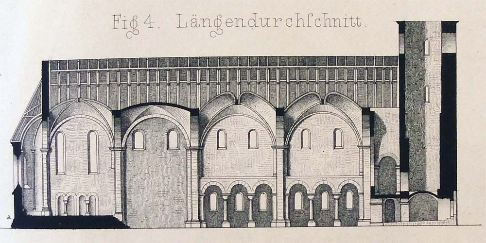 Das Hauptinteresse bietet die Kirche durch die Gewölbeanlage. Die altsächsische Arcadenbildung mit Wechsel von Pfeiler und Säulen möchte fast vermuthen lassen, daß die Wölbung der alten Basilika später gewaltsam aufgedrungen sei. Die Sandsteinschichten der Gewölbepfeiler greifen auch nur unregelmäßig in den Verband der Arcadenpfeiler und Wände ein, und könnte dieser Umstand in jener Vermuthung bestärken. Bei dem Sockel der combinirten Arcaden- und Gewölbepfeiler zeigt sich indeß deutlich, daß die Vorlagen für letztere gleichzeitig mit ersteren entstanden sind, da überall das wiederkehrende Profil der Basis unter beiden Pfeilern aus einem Stück gearbeitet ist, wodurch die ursprüngliche Absicht der Wölbung deutlich erwiesen wird. Ueberdies zeigt die Ornamentik der Arcadensäulen, der Gewölbpfeiler mit den reich verzierten Capitälen ihrer Ecksäulchen, der Friese und Halbsäulen, welche das Aeußere der Absiden zieren, daß das ganze Bauwerk gleichzeitig entstanden ist.