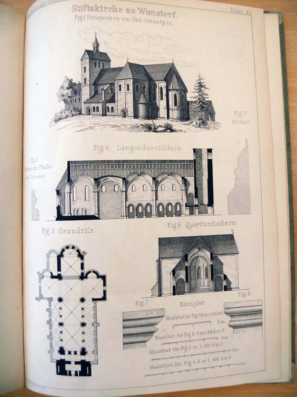 Schließlich fügen wir hinzu, daß die lange Gestalt der Chorfenster modern ist, und in Beziehung auf unsere durch Ueberschriften nicht erklärten Zeichnungen theilen wir mit, daß Blatt 41 Fig. 7 das Profil eines Kämpfers am Eckpfeiler im nördlichen Querschiffe darstellt. In Fig. 8 desselben Blattes zeigt sich die Abbildung eines häufig wiederkehrenden Gesimsprofiles. Auf Blatt 44 sind zwei der großen Säulencapitäle aus den Arcaden des Mittelschiffes abgebildet. Bei der Abbildung der Basis daselbst hat sich bei der Lithographie leider ein Anlauf vom Sockel zum Säulenstamme eingeschlichen, der selbstverständlich fehlt. Die übrigen kleineren und größeren Capitäle gehören theils den an der großen Apsis außen befindlichen Säulen, theils inneren den Gewölbpfeilern eingeschnittenen Ecksäulchen an. Die einzelnen Friesstücke aus Blatt 42, 43 und 44 gehören dem Aeußern der großen Apsis an, woselbst sie in fortlaufender Reihe (siehe die Choransicht Blatt 43) an der schrägen Fläche der Gurtung zwischen den Säulen in seltsamen Gemisch vermauert sind, so daß dies Band einer Musterkarte verschiedener Friesformen gleicht. Die Wölbung der Apsis ist aus dem späten Mittelalter. Die Gewölbdienste daselbst mit gothischen Capitälen setzen sich auf romanische (ursprüngliche) Basen, die weit größer sind als ihr eigener Durchmesser. Diese Basen zeigen, daß ursprünglich daselbst Arcaden stattfanden, die in ähnlicher Weise wie in Idensen (siehe Blatt 31 und 32) die innere Rundung belebten.