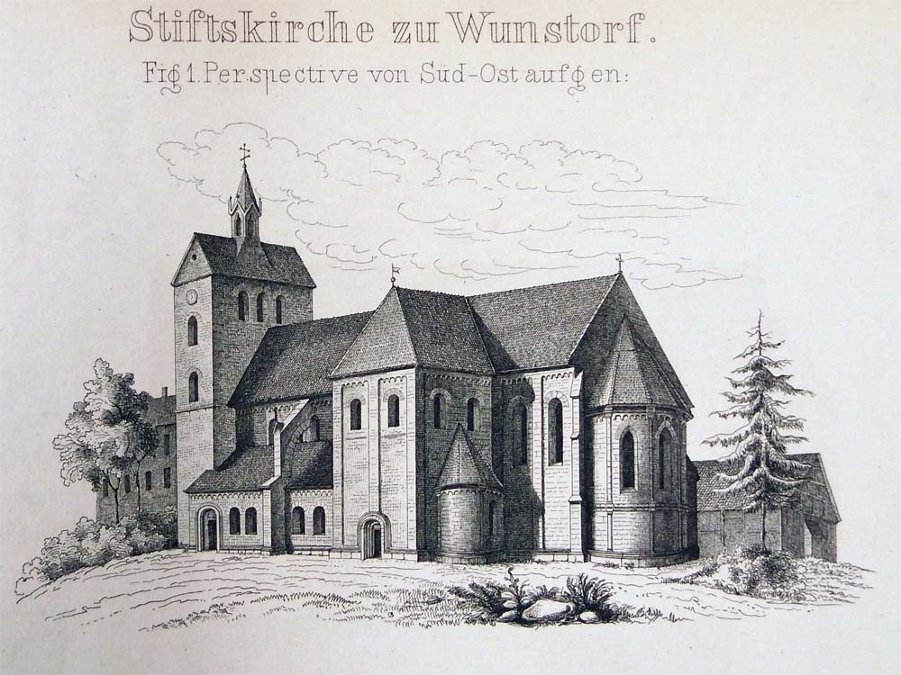 Das Stift Wunstorf *) liegt mit seiner schönen hier näher zu beschreibenden Kirche am östlichen Ende des Städtchens Wunstorf, 3 Meilen westwärts von Hannover zwischen zwei Armen des unweit darunter sich in die Leine ergießenden Aue-Flüßchens. Die Gründung des Stiftes geht in sehr frühe Zeit hinauf. Nach einer Urkunde, welche abschriftlich im Königlichen Archive zu Hannover aufbewahrt wird (Calenberger Urkundenbuch, Archiv des Stifts Wunstorf), nimmt König Ludwig in Ostfranken das von dem Bischofe Diedrich zu Minden gestiftete und der Mindener Kirche unterworfene Nonnenkloster Wunstorf in seinen Schutz. Frankfurt, den 14. October 871.