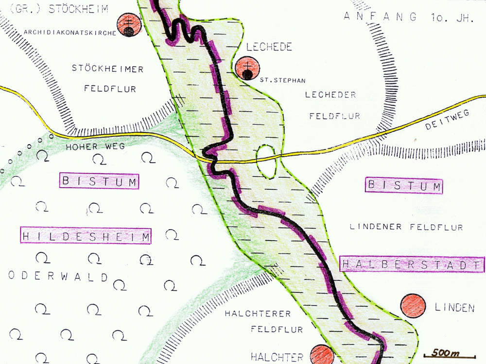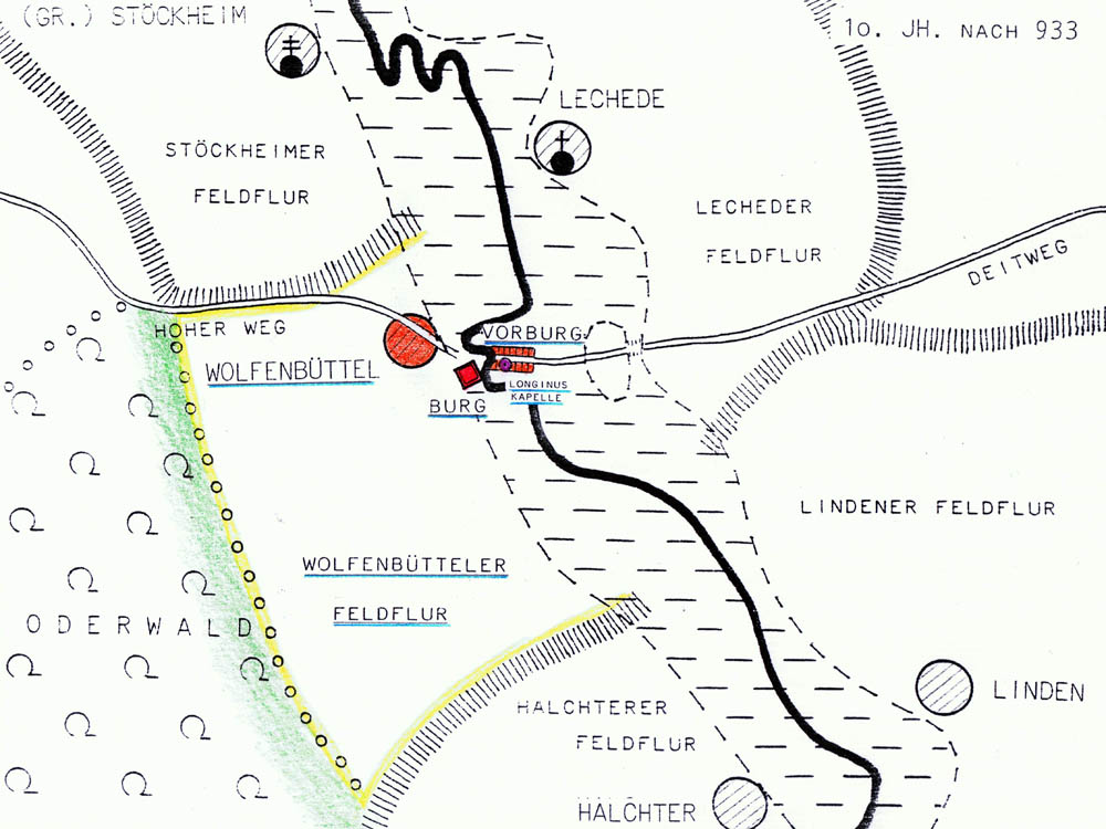 Gelände von der Altbesiedlung in karolingischer oder früherer Zeit (Groß Stöckheim, Halchter) zunächst ausgespart wurde23 und dem natürlichen Wald noch weiterhin überlassen blieb. Demnach würde ein Ausläufer des Oderwaldes‚ die beiden Altgemarkungen voneinander trennend, bis zur Zeit der im 10. Jahrhundert angenommenen Waldrodung hier direkt an die Okerniederung herangereicht haben.
