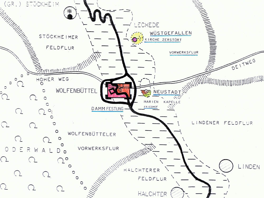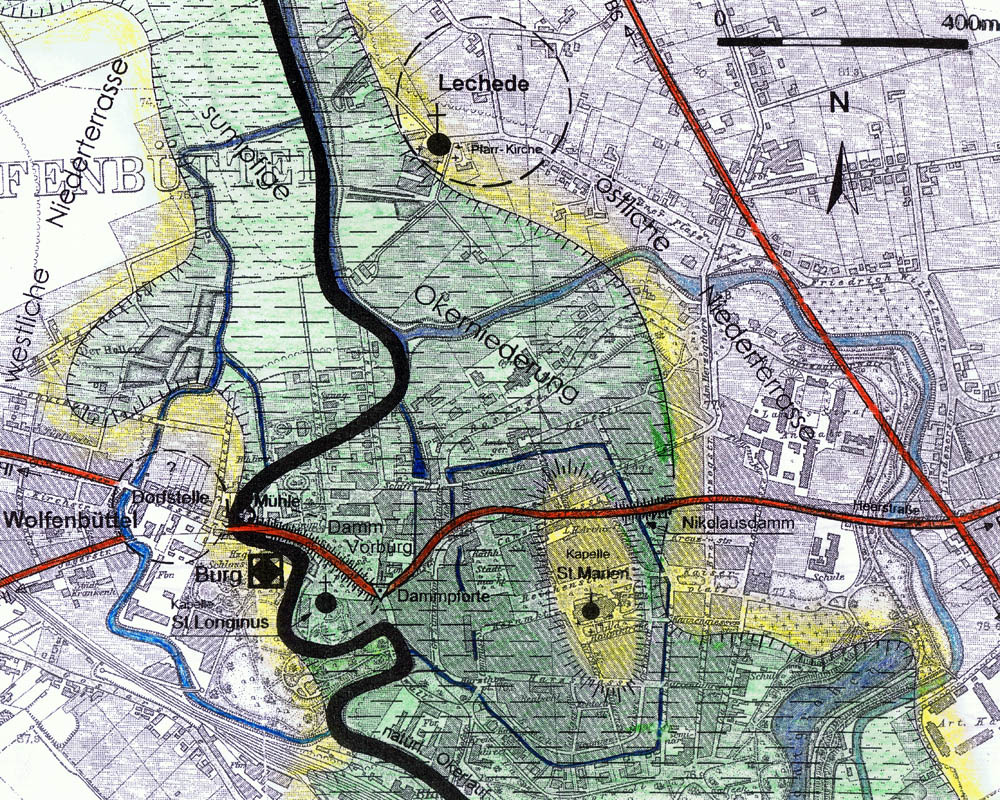Erst im Laufe des 14. Jahrhunderts beginnt sich die Vorstellung von dieser Vorburg- bzw. Dammsiedlung (in dammone prope Wulferbutle) etwas zu verdeutlichen mit einem herzoglichen Vorwerk, mit einer Wassermühle sowie mit den Kapellen St. Longinus (1315 mit curia dotalis versehen)2 und St. Laurentius, welche ebenso wie eine Badstube auf dortselbst ansässige Wohnbevölkerung hindeuten, die in erster Linie mit der Burg in Verbindung zu bringen sein dürfte. Eine Beziehung zu dem nur etwa 600 m in nördlicher Richtung auf dem östlichen Okerufer gelegenen (seit dem 15. Jahrhundert wüst gefallenen) alten Pfarrdorf Lechede3 ist nicht gegeben.