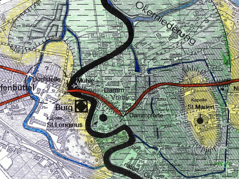 Größeres Gewicht, als das später Friedrich Thöne 1952 gelten lassen wollte,29 kam nach Paul Jonas Meier 1902 dem Okerübergang einer Altstraße als standortlicher Voraussetzung für die Entstehung der Burg Wolfenbüttel direkt am westlichen Rand der Niederung für die Sicherung und ggf. die Sperrung des Flusspasses gegen die Einfälle nach Westen vorstoßender Ungarnscharen im 10. Jahrhundert zu.30 Derartige durch die damalige geostrategische Situation zweifellos gebotene Sicherungsvorkehrungen machte er gleichermaßen für die Entstehung der Burg Dankwarderode